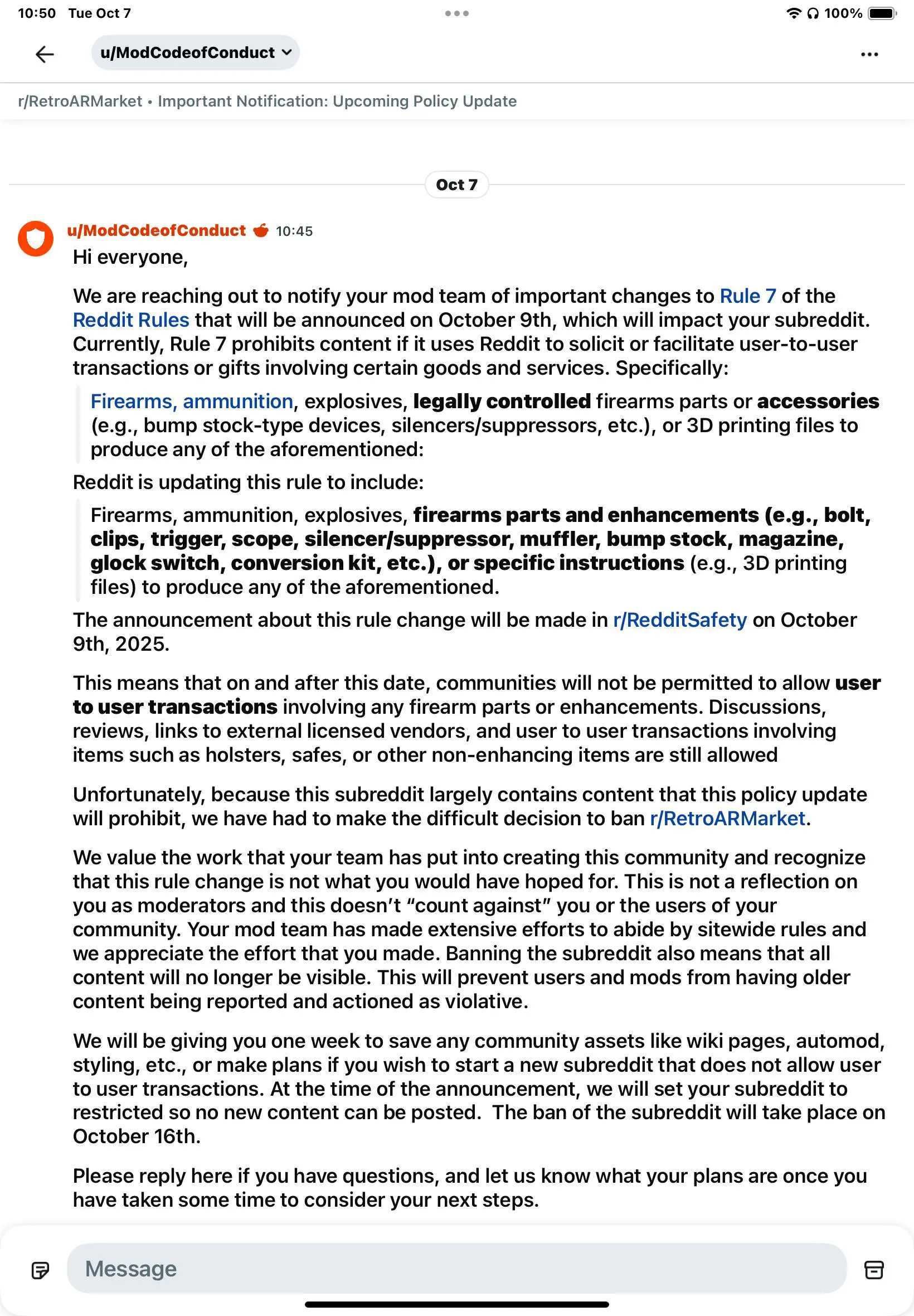 On October 7, 2025, Reddit informed the moderators of multiple gun-parts subreddits that it will be prohibiting content related to buying or selling "firearm parts and enhancements", and therefore will be banning their subreddits permanently.